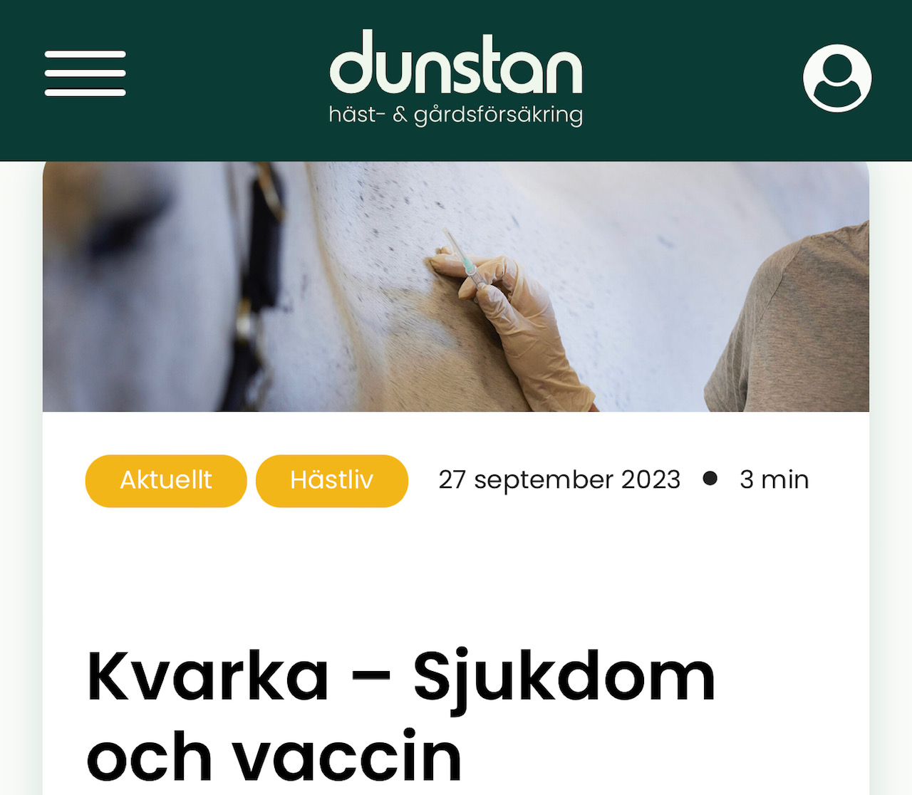 Undvik smittsam och smärtsam sjukdom – vaccinera hästen mot kvarka. Därför lanserar Dunstan häst- och gårdsförsäkring Vaccinationshjälpen. Det innebär att alla Dunstans kunder får ett